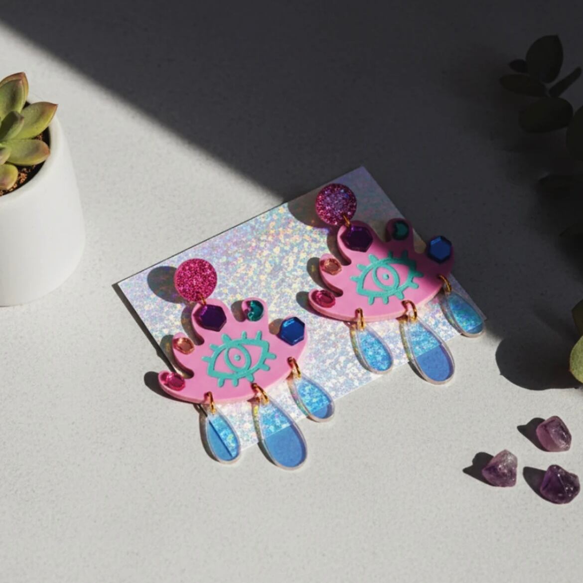 アクリル、ミラーアクリル、グリッターアクリル、オーロラのように輝くイリディセントアクリルを組み合わせ、ゴールドステンレスのポストで仕上げました。淡いパープルを背景に、宝石のようにカットされたミラーアクリルときらめくアクセントが、まるで魔法のお守りのような特別感を放ちます。